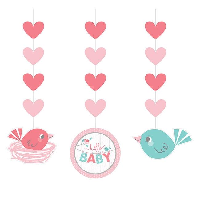 Das dreiteilige Deckenhänger Set "Hello Baby Girl" ist die perfekte Deko für Ihre Baby Shower. Die ca. 91,4 cm langen Hänger sind jeweils mit vier Herzen (ca. 7,5 x 6 cm) und einem größeren Anhänger (zwischen ca. 13 und 17,5 cm) dekoriert. Anhänger als auch Herzen sind beidseitig bedruckt. Zu sehen sind zwei Vögel, davon einer kleiner im Nest, sowie ein Anhänger mit "Hello Baby".