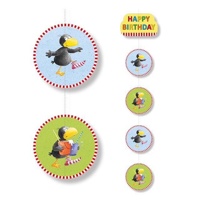 Der Deckenhänger "Kleiner Rabe Socke" hat eine Gesamtlänge von ca. 150 cm und besteht aus fünf aneinandergereihten Papp-Ausschnitten, die allesamt beidseitig bedruckt sind. Zur Befestigung an der Decke wird das Produkt mit einem Nylonfaden geliefert. Der erste Papp-Ausschnitt zeigt die Aufschrift "Happy Birthday" und ist ca. 25 cm breit. Die anderen kreisrunden Ausschnitte sind mit dem kleinen Raben Socke als Motiv bedruckt und haben einen Durchmesser von ca. 18 cm.