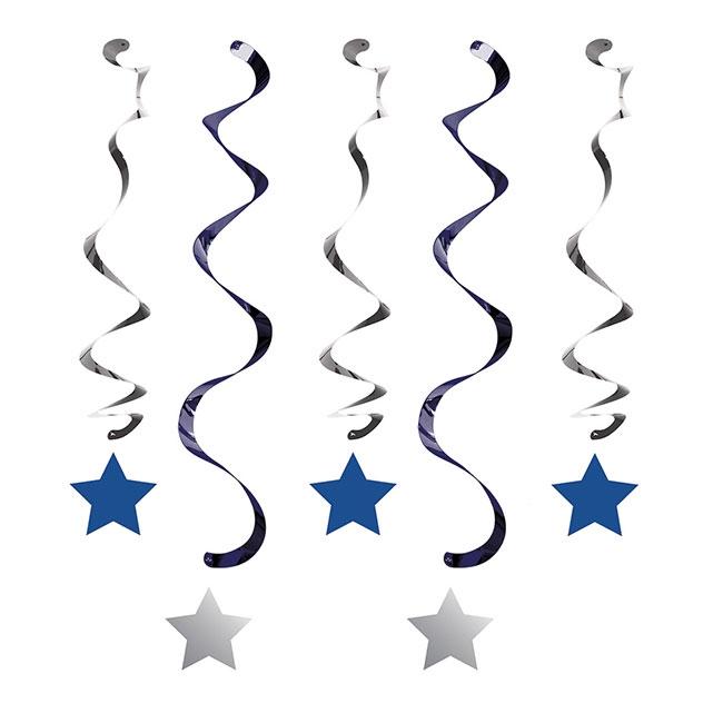 Die Deckenhänger "Little Star" werden 5-teilig geliefert und bestehen aus metallischer Folie. Je nach Auswahl kann zwischen den Farben Rosa in Kombination mit Gold, oder Blau mit Silber gewählt werde. Im Lieferumfang sind 3 Deckenhänger mit einer Länge von ca. 76,2 cm, sowie zwei Deckenhänger mit einer Länge von ca. 99 cm enthalten.