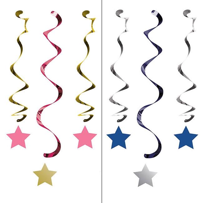 Die Deckenhänger "Little Star" werden 5-teilig geliefert und bestehen aus metallischer Folie. Je nach Auswahl kann zwischen den Farben Rosa in Kombination mit Gold, oder Blau mit Silber gewählt werde. Im Lieferumfang sind 3 Deckenhänger mit einer Länge von ca. 76,2 cm, sowie zwei Deckenhänger mit einer Länge von ca. 99 cm enthalten.