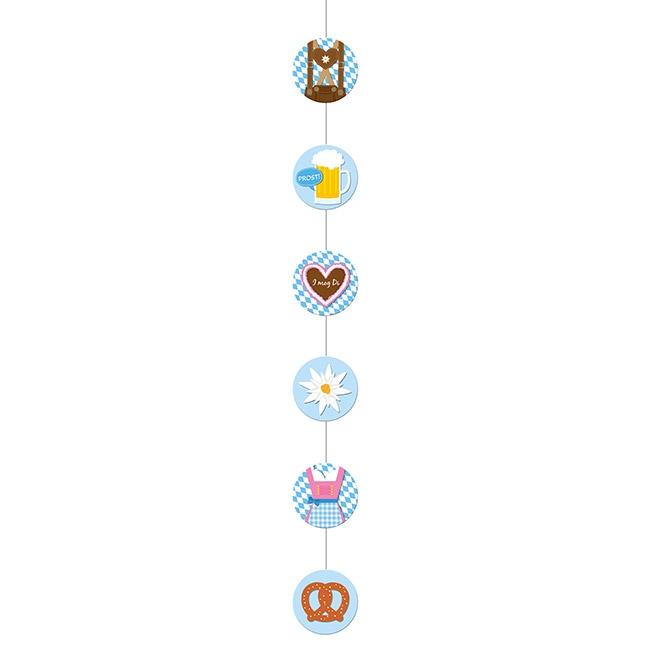Die Deckenhänger "Oktoberfest Gaudi" werden im 4er Pack geliefert. Sie sind ca. 1,30 m lang. Die ca. 13 cm großen Motive (Dirndl, Lederhose, Maß und Brezel), sind beidseitig auf den Kreisen aus Pappe aufgedruckt. Eine transparente Nylonschnur verbindet die Motive.