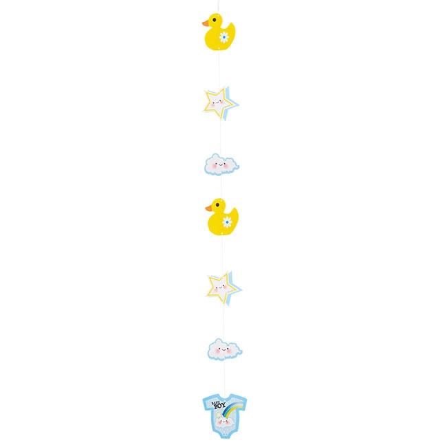 Der Deckenhänger "Schnulleralarm" hat eine Länge von ca. 1,35 m und wird je nach Auswahl in den Farben Blau oder Rosa geliefert. Die einzelne Motive, wie z. B. Sterne, Wolken oder Enten bestehen aus beidseitig bedruckter Pappe. Sie sind an einer Nylonschnur befestigt, mit der Sie den Deckenhänger ganz einfach im Raum befestigen können. Die Ente hat eine Höhe von ca. 11,5 cm.