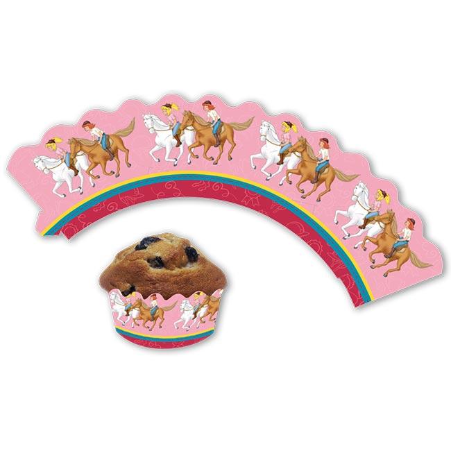 Die Deko-Banderolen für Muffins "Bibi und Tina" werden im 12er Pack geliefert, bestehen aus Pappe und sind ca. 5 cm hoch. Sie sind auf drei unterschiedliche Größen einstellbar und mit Bibi und Tina auf ihren Pferden bedruckt.
