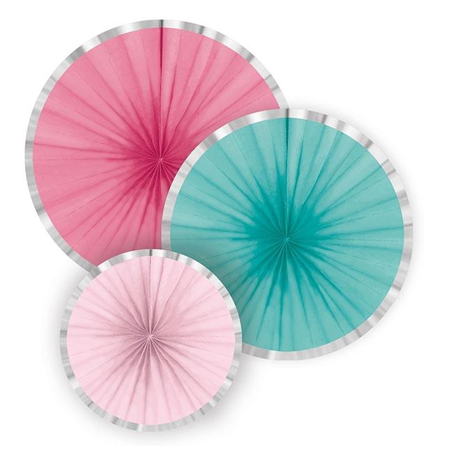 Die Deko-Fächer "Pastell Paradise" bestehen aus dickerem Papier und werden 3-teilig geliefert. Im Lieferumfang enthalten ist ein Fächer in Pink (ca. 35 cm), einer in Türkis (ca. 28 cm) und ein kleiner Fächer in Rosa (ca. 16 cm). Die Ränder der Fächer sind metallisch silbern bedruckt. Sie müssen einfach nur aufgefächert, und mit Hilfe der angebrachten Klebepads fixiert werden. An jedem Fächer ist zusätzlich eine Schnur angebracht die der Befestigung dient.