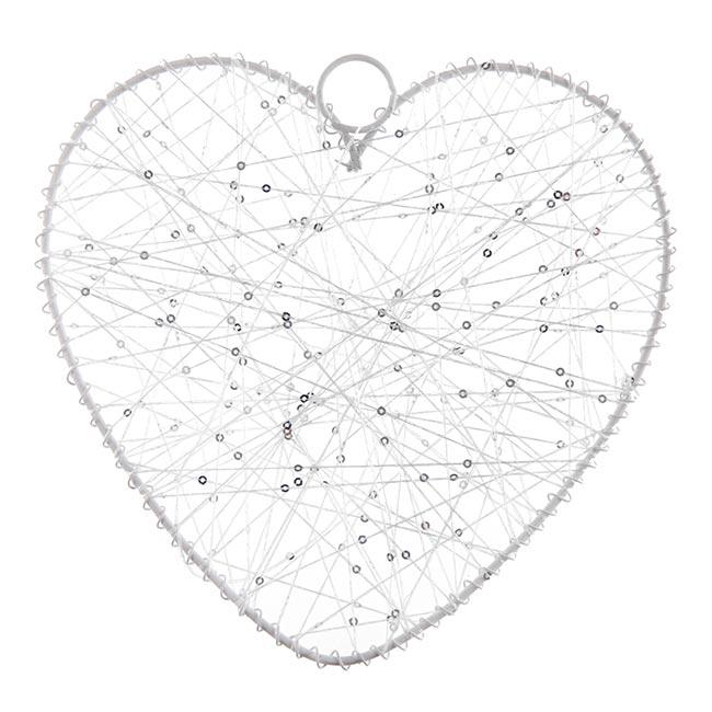 Das weiße Deko-Herz mit silberfarbenen Pailletten hat eine Größe von ca. 25 x 25 cm und besteht aus Metall, Garn und Kunststoff. Viele Garnfäden füllen das Innere aus und sind zusätzlich noch mit Pailletten versehen. Mit der Ring-Vorrichtung am oberen Ende kann das Herz ganz leicht irgendwo aufgehängt werden.