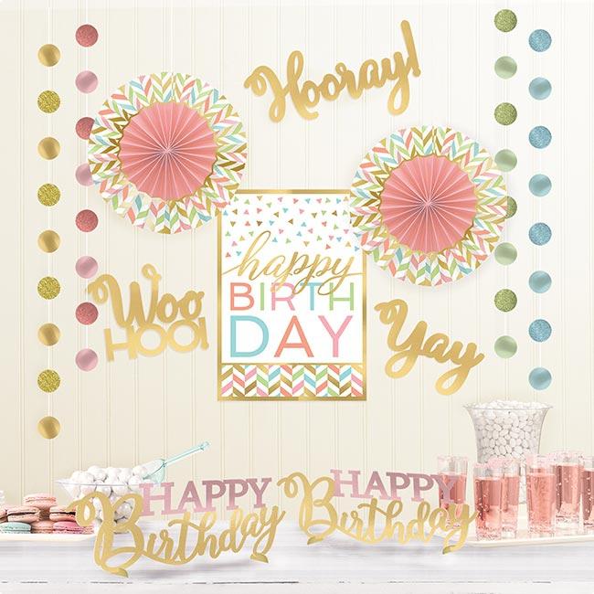 Für eine umfangreiche und tolle Deko ist dieses Deko-Set aus der Serie "Confetti Fun" genau richtig! Das 12-teilige Set beinhaltet vier ca. 2,13 m Girlanden aus glänzenden und glitzernden Punkten, zwei ca. 35,5 cm groß Tischaufsteller ("Happy Birthday") in Gold und Rosa, zwei Deckendeko Fächer (ca. 30,4 cm), eine ca. 36,8 cm groß Wanddeko ("Happy Birthday") sowie drei goldene Wanddekorationen ("Hooray!", "Woo Hoo!", "Yay") die zwischen ca. 25,4 cm und ca. 34,2 cm groß sind. Das komplette Set wird gefaltet geliefert, und muss ggf. noch zusammengesteckt oder aufgefächert werden. Farblich ist das Set in Gold, Weiß, Rosa, Hellblau und Grün gehalten.