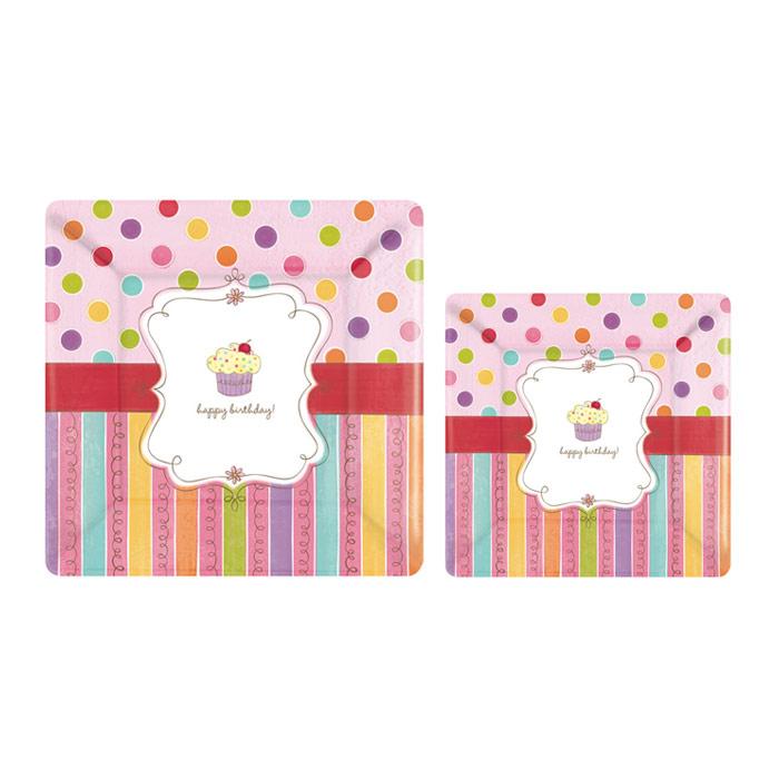 Eckige Happy Birthday-Pappteller "Pünktchen & Streifen" 8er Pack