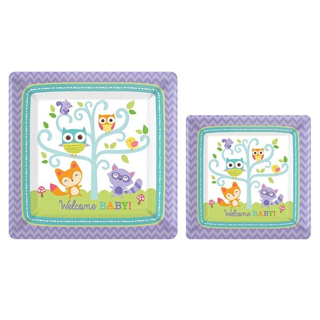 Die eckigen Pappteller "Süße Waldbewohner" werden im 8er Pack geliefert und sind in zwei verschiedenen Größen erhältlich. Abhängig von Ihrer Auswahl haben die Pappteller dann eine Größe von ca. 18,5 x 18,5 cm oder ca. 26 x 26 cm. Die süßen Waldbewohner, die auf den Tellern zu sehen sind, lädt man doch gerne zu sich auf die Baby-Party ein!