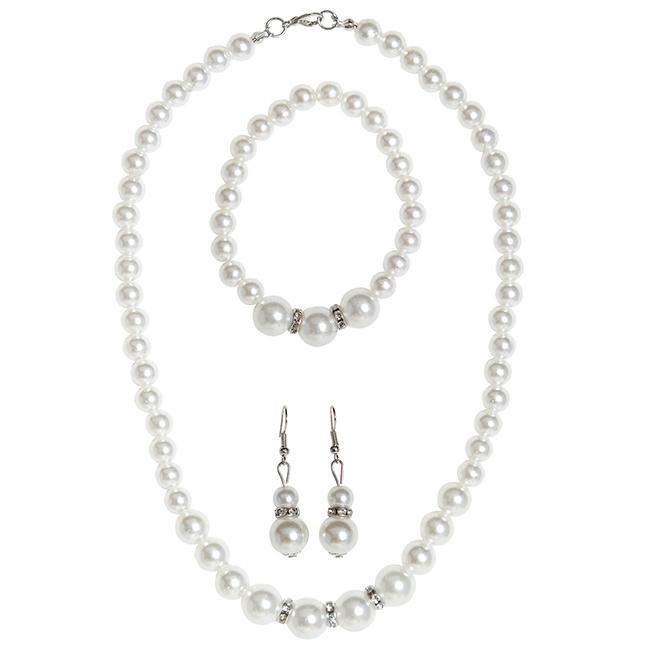 Das edle Schmuck-Set mit Perlen umfasst vier Teile: Eine kurze Kette, ein Armband und ein Paar Ohrringe für Ohrlöcher. Bitte beachten Sie, dass lediglich diese vier Teile im Lieferumfang enthalten sind. Alle anderen Artikel, die Sie den Abbildungen entnehmen können, werden NICHT geliefert. Es handelt sich bei dem Schmuck-Set um eine Einheitsgröße für Erwachsene aus Kunststoff und Metall. Die Perlen sind weiß und werden von silberfarbenen, eingefassten Schmucksteinchen ergänzt.