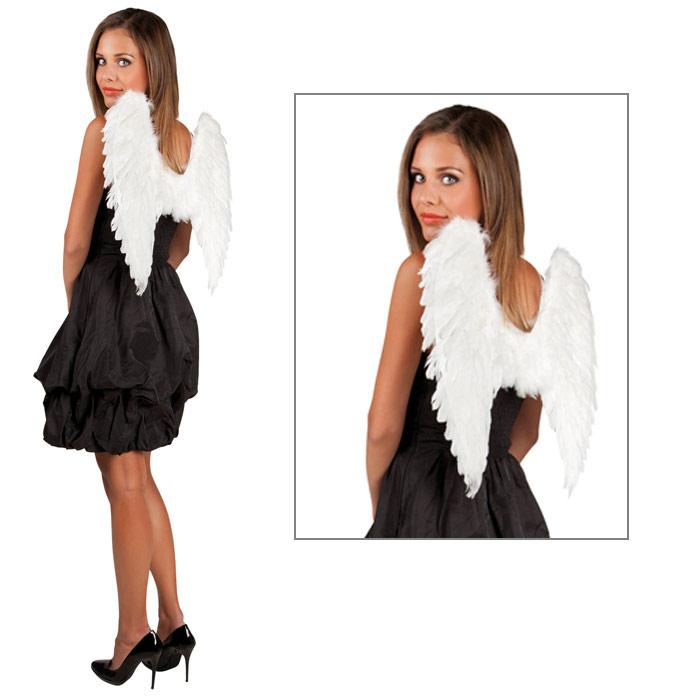 Die Flügel bestehen aus echten Federn und lassen sich im Handumdrehen über den Rücken spannen, denn an den Flügeln sind weiße Gummibänder befestigt, die Sie einfach über die Schultern ziehen. Alternativ zum Engelchen können Sie die Flügel aber auch für ein Vogel-Kostüm verwenden. Nun können Sie hoch in den Himmel schweben ;-) !
