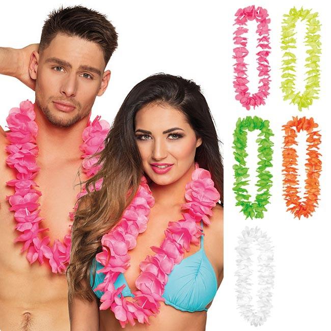 Die einfarbigen Hawaii Blumenketten Deluxe bestehen aus Polyester. Sie sind in den Farben Weiß, Neonpink, Neongelb, Neongrün und Neonorange erhältlich. Ihre Länge beträgt ca. 56 cm (entspricht einem Umfang von ca. 112 cm).