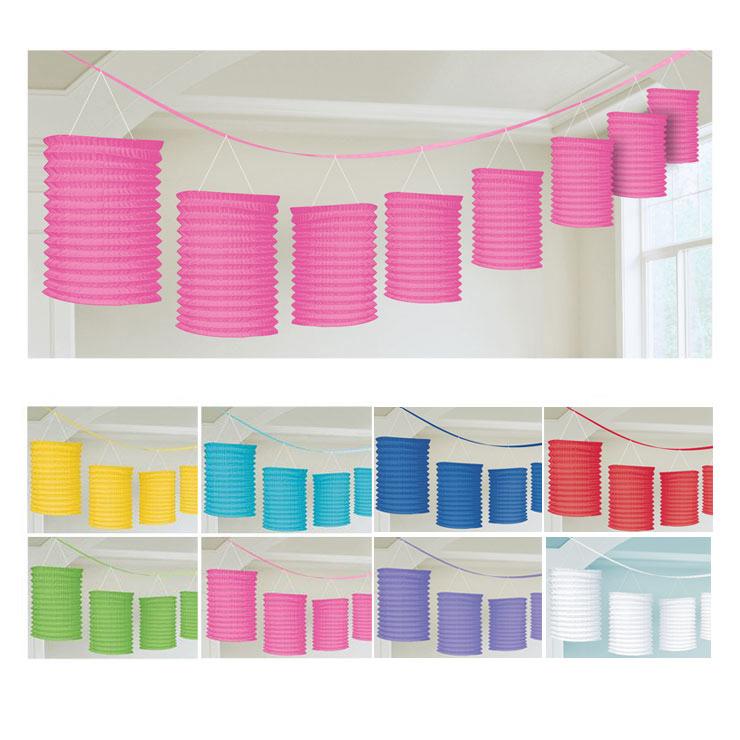 Mit dieser Girlande schmücken Sie jeden Garten und jeden Partyraum perfekt passend zum jeweiligen Partymotto. Die Laternen-Girlande besteht - je nach gewählter Farbe - aus acht auseinander faltbaren Laternen aus Pappe mit einem oberen Durchmesser von je ca. 10 cm. Die einzelnen Laternen sind durch ein farblich passendes Satin-Band miteinander verbunden und können so schön in Ihrer Party-Location aufgehängt werden.