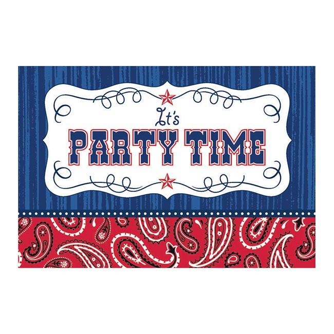 Die acht Einladungskarten "Bandana und Jeans-Style" bestehen aus Pappe und haben eine Größe von etwa 11 x 16 cm. Das Motiv der Pappkarten ist größtenteils rot, blau und weiß. In der Mitte der Einladungskarten, die wie Postkarten gestaltet sind, ist die aussagekräftige Aufschrift "It's Party Time" aufgedruckt. Am Rand der Karten ist ein rotes Paisley-Muster mit schwarz-weißen Ornamenten zu sehen, wie man es von Cowboy-Halstüchern aus Western-Filmen kennt. Der blau gestreifte Hintergrund lässt sich mit den typischen Jeans-Hosen der Cowboys in Verbindung bringen. Zu dem Einladungskarten-Set im 8er Pack gehören außerdem jeweils acht rote Umschläge aus Papier, Briefsiegel - mit Hufeisen-Motiv - und Sticker mit der Aufschrift "Save the Date".
