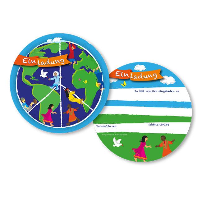 Die Einladungskarten "Eine Welt" zeigen eine runde Weltkugel mit spielenden Kindern, ein Friedenszeichen und die Aufschrift Einladung auf der Vorderseite. Auf der Rückseite kann man alle wichtigen Details der Party eintragen. Die kreisrunde Einladungskarte ist aus Pappe gefertigt und hat einen Durchmesser von ca. 14 cm.