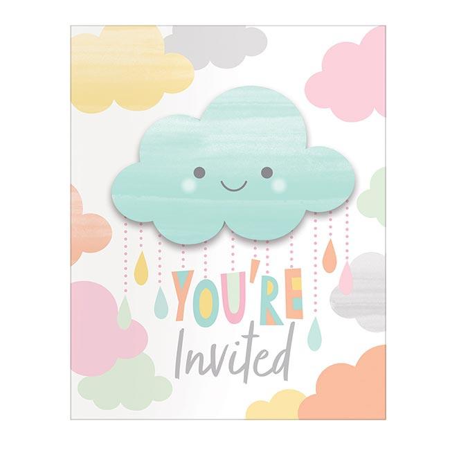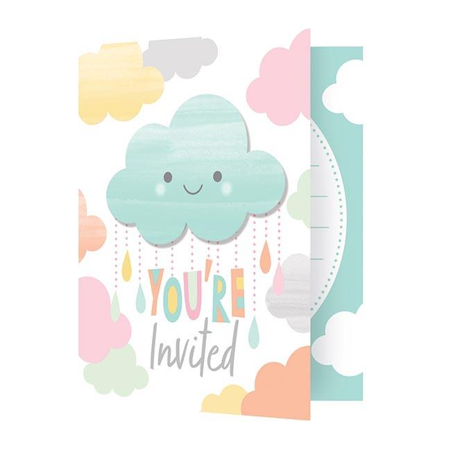 Die Einladungskarten "Kleiner Sonnenschein" werden im 8er Pack mit passenden Umschlägen aus Papier geliefert. Diese weißen Umschläge messen ca. 10,7 x 13,3 cm. Im Lieferumfang sind außerdem acht Wölkchen mitsamt Aufklebern enthalten, die Sie selbst auf die Einladungskarten kleben können. Auf diese Weise hebt sich die lächelnde Wolke besonders schön vom Rest der Karte ab. Die Einladungskarten aus Pappe selbst sind ca. 10,1 x 12,7 cm groß und sind mit Wolken in verschiedenen Farben bedruckt. Außerdem zeigt die Vorderseite die Aufschrift "You're Invited". Klappt man die Karte auf, sind sieben (unbeschriftete) Linien zu sehen. Hier können Sie alle Infos rund um Ihre Babyfeier eintragen!