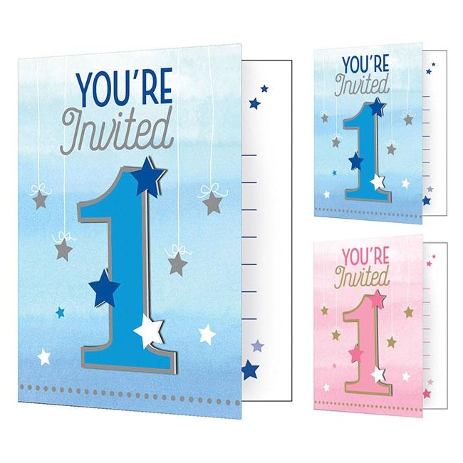 Die Einladungskarten "Little Star" werden im 8er Pack geliefert. Jede Einladung kommt inklusive eines passenden Umschlags. Gefaltet haben die Karten eine Größe von ca. 10 x 12,5 cm. Die Umschläge sind ca. 13,3 x 10,7 cm groß. Je nach Auswahl kann zwischen den Farben Blau oder Rosa gewählt werden. Die blauen Karten sind mit silbernen Details bedruckt, die rosa Karten mit goldenen Details. Innen sind die Karten auf einer Seite liniert, und können so mit allen wichtigen Infos zu Ihrer Party beschriftet werden. Im Lieferumfang sind außerdem sieben Klebepads, sowie sieben Cutouts in Form einer 1 enthalten. Diese müssen selbst auf den restlichen Karten angebracht werden. Eine Karte wurde bereits als Beispiel dekoriert.