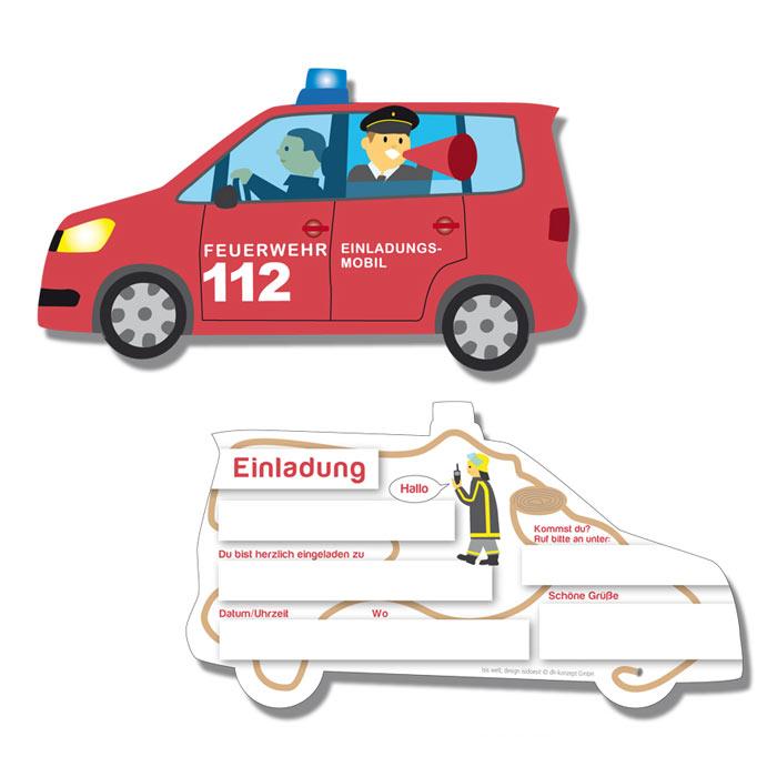 Die Vorderseite der Einladungskarten wird die Freunde und Klassenkameraden Ihres Kindes sofort begeistern. Ein Party ganz nach dem Motto Feuerwehr? Super! Zu sehen ist auf der Vorderseite das Einladungs-Mobil der Feuerwehr. Auf der Rückseite haben Sie oder Ihr Kind die Möglichkeit den entsprechenden Text einzutragen. In vordefinierte Felder tragen Sie folgende Dinge ein: Den Namen des Eingeladenen, ein Feld um welche Party es sich handelt ("zu meinem Geburtstag"), die Telefonnummer, Datum, Uhrzeit und den Ort. Raum für eine Verabschiedung lassen diese Einladungskarten ebenfalls.