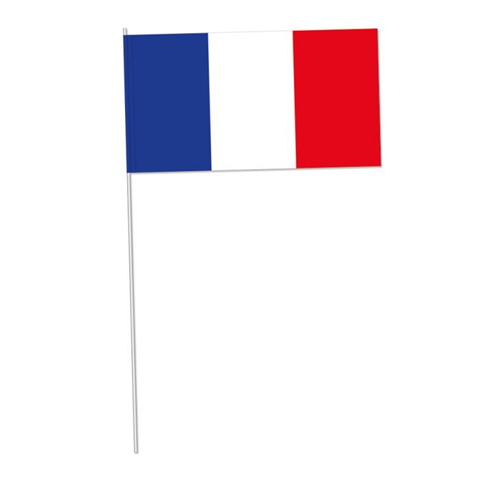 Vive la France! Mit diesen Fahnen sieht jeder Ihre Sympathien für unser Nachbarland. Die Fahnen bestehen aus beidseitig bedrucktem Papier und haben eine Größe von ca. 12 x 21 cm. Der Kunststoffstab ist ca. 38 cm lang.