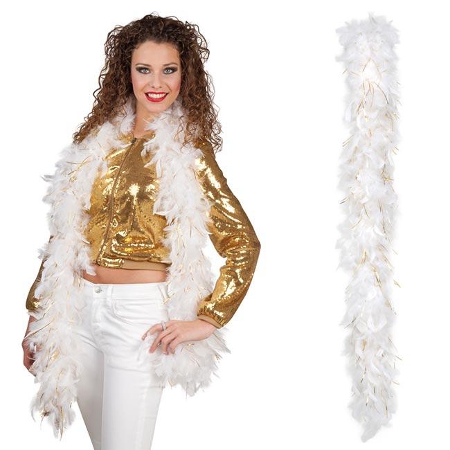 Mehr Info: Diese schöne Federboa ist komplett mit weißen Federn bestückt, dazwischen ist entweder Gold- oder Silber-Lametta eingearbeitet.