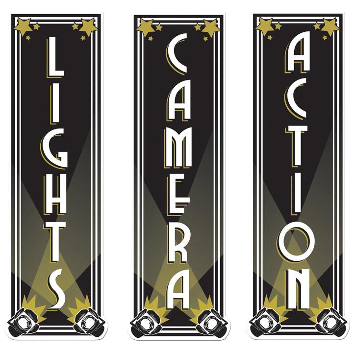 Filmdreh-Schilder "LIGHTS, CAMERA, ACTION" 61 cm 3er Pack