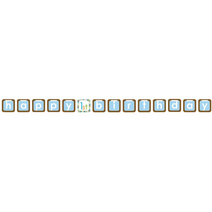 Diese Girlande besteht aus Filz und ist mal eine Abwechslung gegenüber herkömmlichen Girlanden aus Pappe. Die Girlande besteht aus Vierecken, auf denen jeweils ein Buchstabe steht. Die Zeichenkette aus den Buchstaben ergibt die Aufschrift "happy 1st birthday", wobei das bunte Viereck mit der Aufschrift "1st" aus Pappe gefertigt ist, der Rest besteht aus Filz. Die Vierecke der Girlande haben eine Breite von ca. 13 cm. Der Untergrund ist braun und hellblau, die Buchstaben sind weiß gehalten. Die Girlande wird von einer weißen Schnur zusammengehalten und kann so ganz leicht befestigt werden. Sie ist ca. 270 cm lang und einseitig bedruckt.