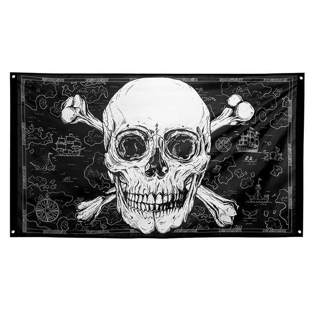 Die Flagge "Totenkopf des Grauens" besteht aus Polyester. Sie hat eine Breite von ca. 150 cm und eine Höhe von ca. 90 cm. An den vier Ecken sind Metallösen zur stabilen Befestigung vorhanden. Der Druck ist auf beiden Seiten gleich intensiv. Zu sehen ist ein großer Totenkopf in der Mitte vor einer alten Piratenkarte als Hintergrund-Motiv.