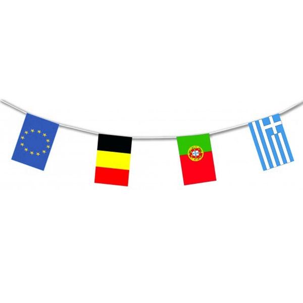 Diese Flaggen-Girlande mit den Flaggen europäischer Länger hat eine Länge von ca. 10 m. Sie umfasst 29 Wimpel, auf denen die Flaggen hochkant zu sehen sind. Mit dabei sind unter anderem: Europa, Deutschland, Slowakai, Portugal, Großbritannien, Frankeich, Niederlande, Ungarn, Schweden, Lettland, Malta, Estland, Zypern und viele andere, Große wie Kleine.