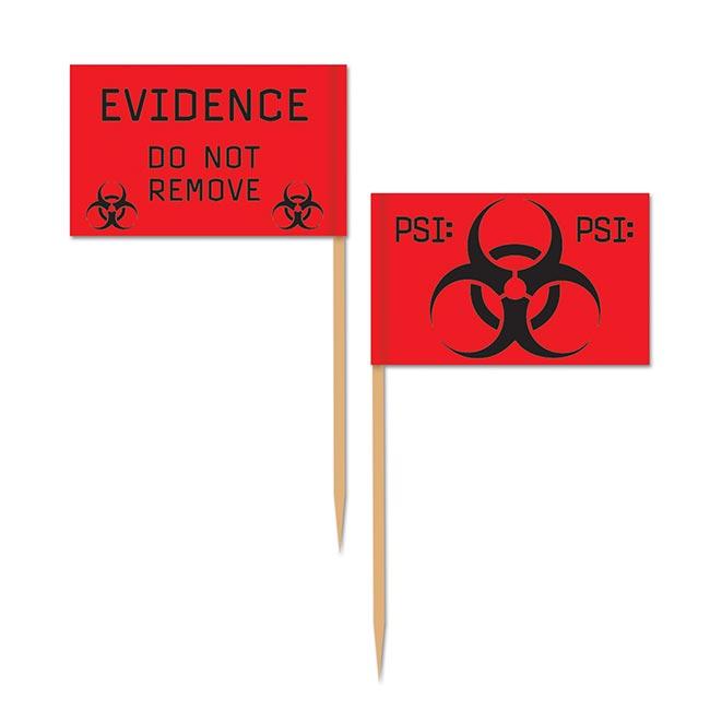 Wer eine Krimi Party feiern möchte oder für die Kids eine Detektiv Mottoparty planen möchte, der sollte sich für diese Flaggen-Picker entscheiden. Die Picker bestehen aus einer Flagge in Rot, welche in Schwarz mit "EVIDENCE do not remove" bedruckt sind. Das heißt so viel wie "Hinweis - bitte nicht entfernen". Denn Detektive brauchen Beweise um den Fall zu lösen und diese sollten nicht beseitigt werden. Die Picker werden im 50er Pack geliefert und haben eine Größe von ca. 4 x 6 cm.