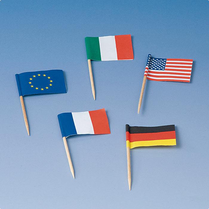 Zu einer internationalen Party gehört auch jede Menge Flaggen. Auf diesen Flaggen-Pickern sind die Flaggen von Deutschland, Frankreich, Italien, Europa und den USA abgebildet. So können Sie entweder die Leckereien und Spezialitäten aus den einzelnen Länder entsprechend markieren oder aber sie mischen einfach alle Flaggen-Picker und verteilen diese ausgeglichen auf allen Speisen.