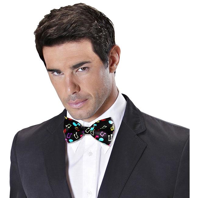 Die Fliege ist in schwarz gehalten und mit bunten Musiknoten bedruckt. Sie ist mit einem variabel verschließbarem Band ausgestattet, das mit Hilfe eines Verschlusses geschlossen wird. Die Fliege hat eine Breite von ca. 14 cm und eine Höhe von ca. 7,5 cm.
