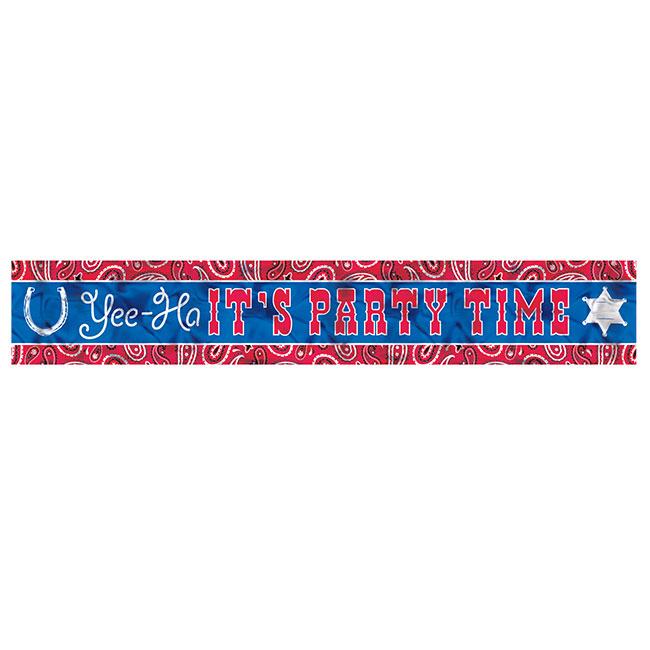 Mehr Info: Das Banner ist mit "It´s Party Time" bedruckt und typische Motive wie ein Hufeisen zieren das Bild.