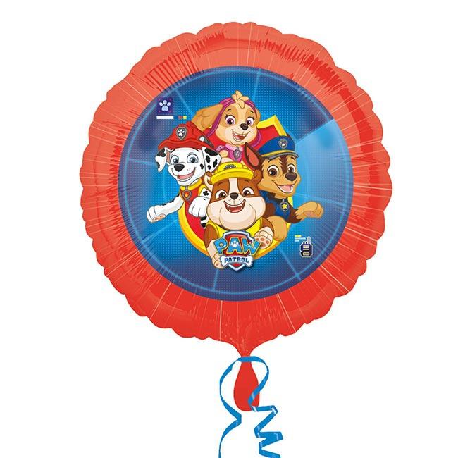 Der Folienballon "Paw Patrol Tierische Helden" hat einen Durchmesser von ca. 43 cm (ungefüllt) und ist aus einer metallischen Folie gefertigt. Abgebildet sind die Fell Freude Marshall, Sky, Rubble und Chase. Der Folienballon ist mittig blau und der äußere Rand ist rot.