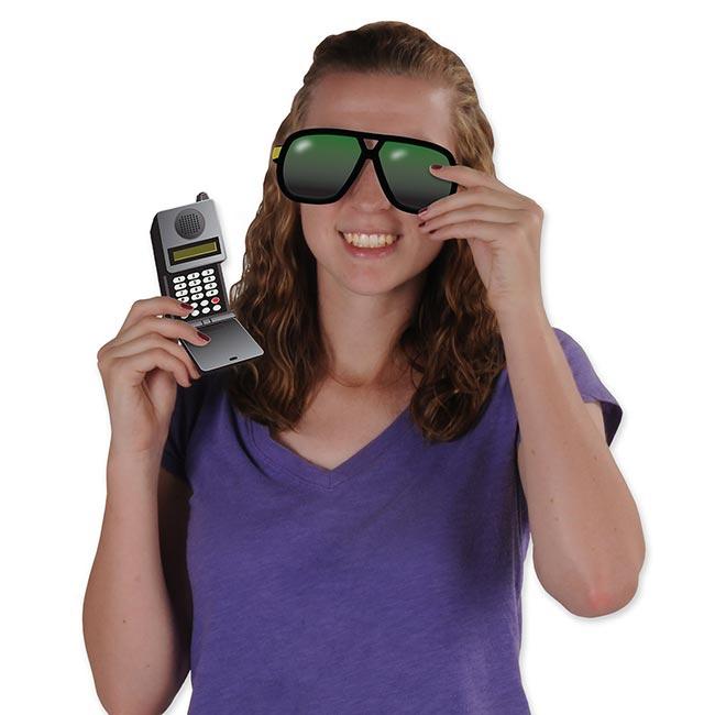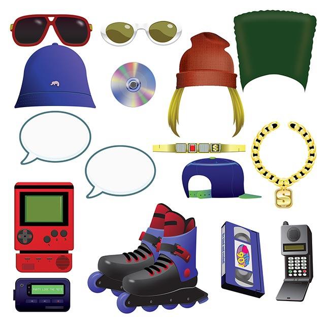 Das Foto-Requisiten-Set "I love the 90s Party" besteht aus beidseitig bedruckter Pappe. Die verschiedenen Motive haben eine Größe von ca. 10 - 30 cm. Im Lieferumfang sind 16 Motive rund um die 90er enthalten: Inlineskates, "I love the 90s"-Sprechblase", MP3-Player, Handheld-Konsole, Mütze, "Dude"-Sprechblase, CD, Mütze mit Haaren, zwei Sonnenbrillen, Gürtel, Kappe, Handy, Videokassette, Goldkette und Afrofrisur. Die Rückseite ist farblich oft anders gestaltet oder kann im Fall der Sprechblasen selbst beschriftet werden.