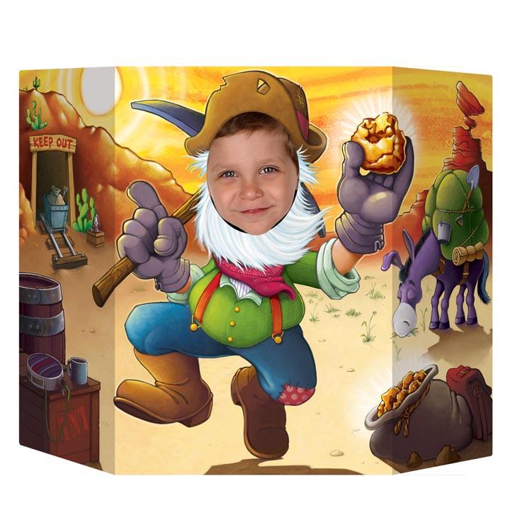 So brechen auf jedem Geburtstag und der Kinder-Mottoparty goldene Zeiten an! Mit dieser Fotowand krönen Sie jede Cowboy-Party mit einer bleibenden Erinnerung für die kleinen und auch großen Gäste. Einmal den Kopf durch das Loch stecken, schon hält ein wahrer Goldgräber seinen stolzen Fund in die Kamera. Im Hintergrund verschönern Mineneingang und Lastenesel die detailreiche, stimmungsvolle Szenerie.