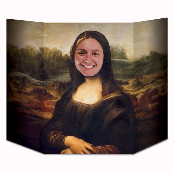 Die Fotowand ist als Aufsteller gedacht. Sie hat eine Größe von ca. 94 cm x 64 cm. Das Foto ist dem Originalfoto nachempfunden - nur ist das Gesicht der Mona Lisa ausgespart, damit man dort seinen eigenen Kopf durchstecken kann. Fehlt nur noch das bezaubernde Lächeln. Am Besten stellt man den Aufsteller auf den Tisch. Für Kinder kann er auch auf dem Boden platziert werden.