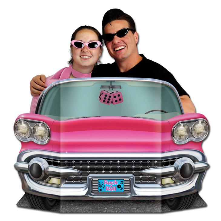 Dieser stylische Fotoaufsteller ist ca. 94 cm x 64 cm groß. Auf dem Aufsteller ist ein pinkfarbener Cadillac zu sehen. Stellen Sie die Fotowand am besten auf den Tisch und stellen oder setzen sich dahinter. So wirkt es, als säßen Sie in einm Cadillac. Noch originellere Fotos erzielen Sie, wenn Sie sich im John Travolta oder Oliva Newton-John Look stylen.