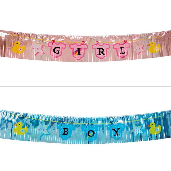 Die Fransengirlande "Schnulleralarm" besteht aus metallischer Folie und ist ca. 150 cm lang. Farblich können Sie zwischen Blau und Rosa wählen. Die Girlande ist mit gelben Badeenten und, farblich entsprechend, mit "Girl" oder "Boy" bedruckt. Das Motiv ist einseitig gedruckt, die Rückseite der Girlande ist silbern.