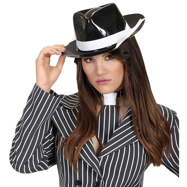 Dieser Gangster-Hut besteht aus PVC und ist für Frauen und Männer geeignet. Er wird in einer Einheitsgröße geliefert und ist schwarz. Um den Hut herum ist ein weißes Band geklebt.