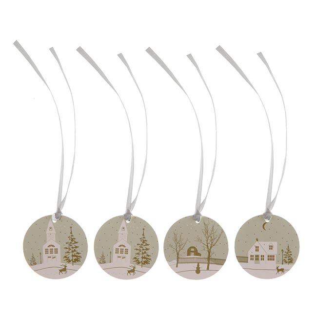 Für wen ist wohl welches Geschenk? Die Geschenkanhänger "Winterwelt" werden im 12er Pack geliefert. Sie bestehen aus einseitig bedruckter Pappe und haben einen Durchmesser von ca. 5 cm. Jeder Anhänger ist mit einer winterlichen Landschaft bedruckt und mit einem weißen Band aus Satin versehen.