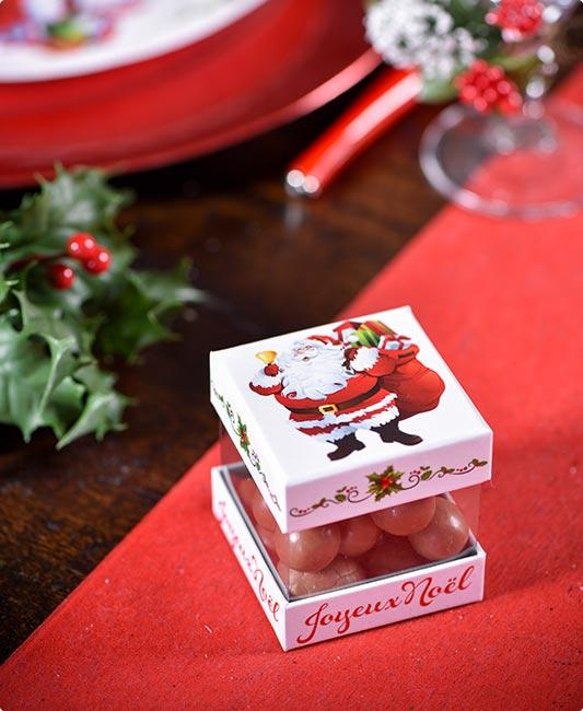 Die Geschenkboxen "Joyeux Noel" werden im 4er Pack geliefert. Deckel und Boden der Boxen bestehen aus Pappe und sind ca. 6 x 6 cm groß und ca. 1,8 cm hoch. Der Deckel ist mit einem Weihnachtsmann und Ilex Girlanden bedruckt, den Boden ziert der Schriftzug "Joyeux Noel". Zwischen Boden und Deckel ist ca. 2,4 cm breiter transparenter Kunststoff der den Blick auf den Inhalt frei gibt. Insgesamt haben die Boxen eine Größe von ca. 6 x 6 x 6 cm.
