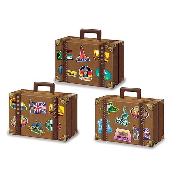 Die Geschenkboxen "Weltreise" sind in Form von Koffern gestaltet und bestehen aus Pappe. Vor Gebrauch müssen diese noch von Ihnen "aufgebaut" werden. Im Lieferumfang sind drei Boxen enthalten, die jeweils eine Größe von ca. 10 x 14 cm aufweisen.