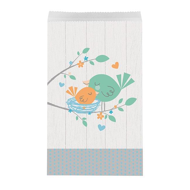 Die Geschenktütchen "Hello Baby Boy" bestehen aus Papier und werden im 10er Pack geliefert. Sie sind ca. 11,5 cm breit und ca. 18,5 cm hoch. Als Motiv sind zwei Vögel in einem Nest abgebildet.