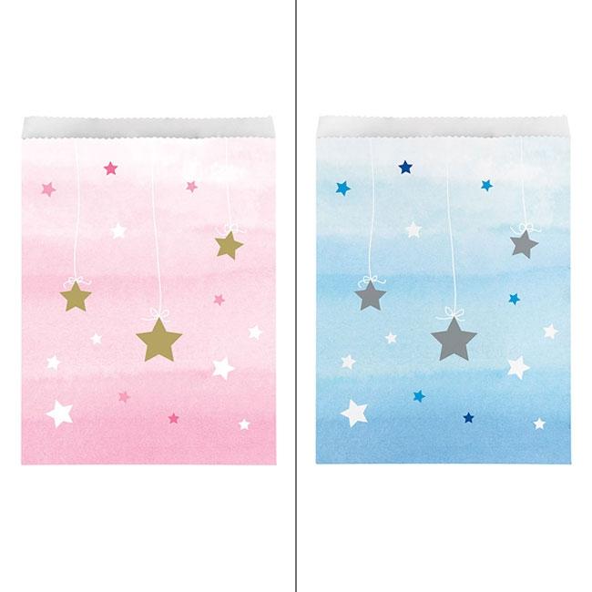 Die Geschenktütchen "Little Star" werden im 10er Pack geliefert und bestehen aus Papier. Je nach Auswahl kann zwischen den Farben Blau und Rosa gewählt werden. Der Hintergrund der Tüten erweckt den Eindruck er wäre mit zarten Wasserfarben gemalt. Je nach Ausführung sind die Sterne entweder in den Farben Blau und Silber, oder in den Farben Rosa und Gold gehalten. Die Tütchen haben gefaltet eine Größe von ca. 16,5 x 22 cm (inkl. Lasche).