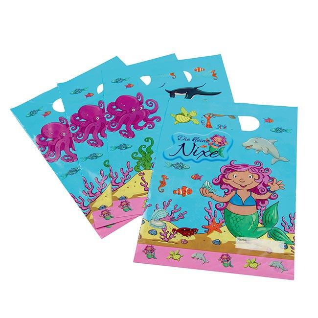 Die Geschenktütchen "Die kleine Nixe" werden im 8er Pack geliefert. Sie bestehen aus beidseitig bedruckter Kunststofffolie. Die Breite beträgt ca. 16,5 cm und die Länge ca. 23 cm. Die Tütchen sind mit einer bunten Unterwasser-Welt und natürlich der kleinen Nixe bedruckt. Die Tütchen können individuell mit dem Namen der Kinder bedruckt werden.