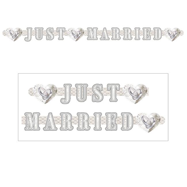 Die Girlande "Edle Hochzeitsfeier" besteht aus Pappe und hat eine Gesamtlänge von ca. 215 cm. Die Höhe der Buchstaben beträgt ca. 16 cm. Die Girlande dient als Banner mit der Schrift "Just Married" - Frisch Verheiratet!