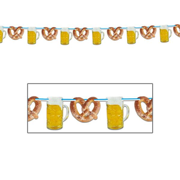 Auf das Oktoberfest freut man sich meist schon Wochen im Voraus. Die Stimmung, das Wetter, die Partylaune. Bei den Vorfreuden keine geringe Position nimmt das Maß Weizenbier und natürlich auch die leckeren Brezn ein, die es alljährlich wieder in großen Mengen gibt. So schlemmt das bayerische Herz liebend gern! Mit dieser Girlande setzen Sie die beiden Verkaufsschlager stilgerecht in Szene. Die Girlande hat eine Länge von ca. 10 m und kann damit sehr großflächig für die passende Deko sorgen!