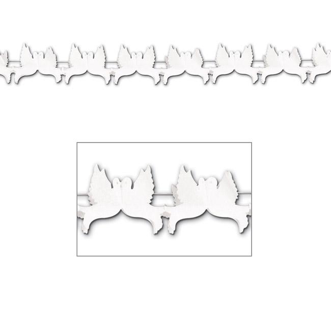 Die Girlande hat eine Länge von ca. 3,7 und wird mit Schnüren an Haken oder mit Klebeband befestigt. Wenn Sie diese Girlande tief über den Tisch hinunter hängen lassen, erleben Ihre Gäste die Deko hautnah und können sich genau so wie das Brautpaar an ihr erfreuen. Und da Tauben die Überbringer froher Botschaften sind (das wusste bereits Noah mit seiner Arche), passen diese Turteltauben super zur Hochzeitsdeko!