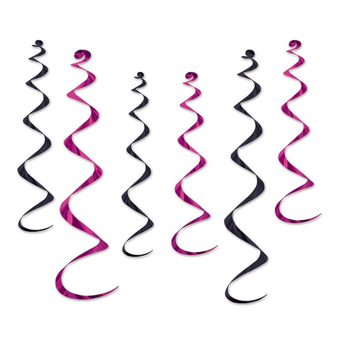 Die Wirbeldeckenhänger bestehen aus Kunststoff und sind hochglänzend. Dieses Set besteht aus insgesamt 6 Deckenhängern, wobei 4 Stück eine Länge von ca. 61 cm haben und 2 Stück ca. 91 cm lang sind. Die Hänger sind jeweils abwechselnd einfarbig, schwarz oder violett.