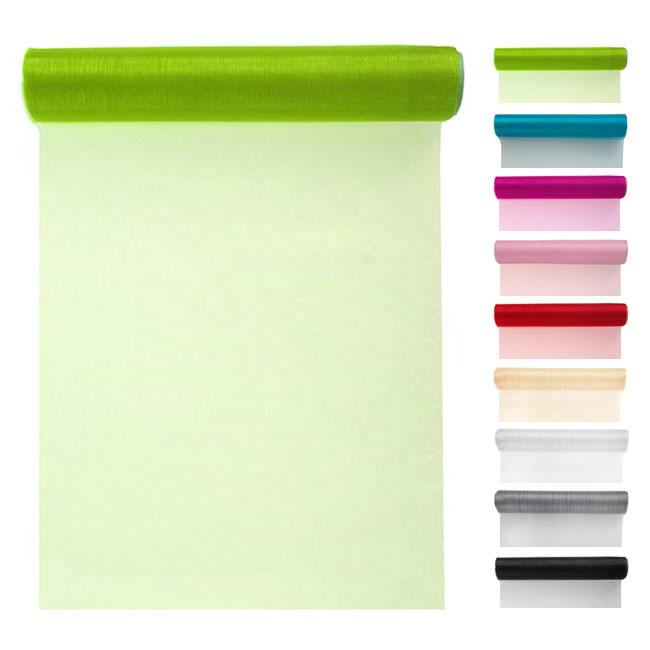 Der glänzende Tischläufer hat eine Gesamtlänge von ca. 5 m und besteht aus Organza. Er ist außerdem ca. 28 cm breit und in vielen Farben erhältlich. Sie können wählen zwischen: Weiß, Grau, Rosa, Rot, Türkis, Grün, Schwarz, Pink oder Elfenbein.