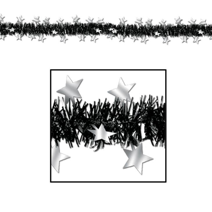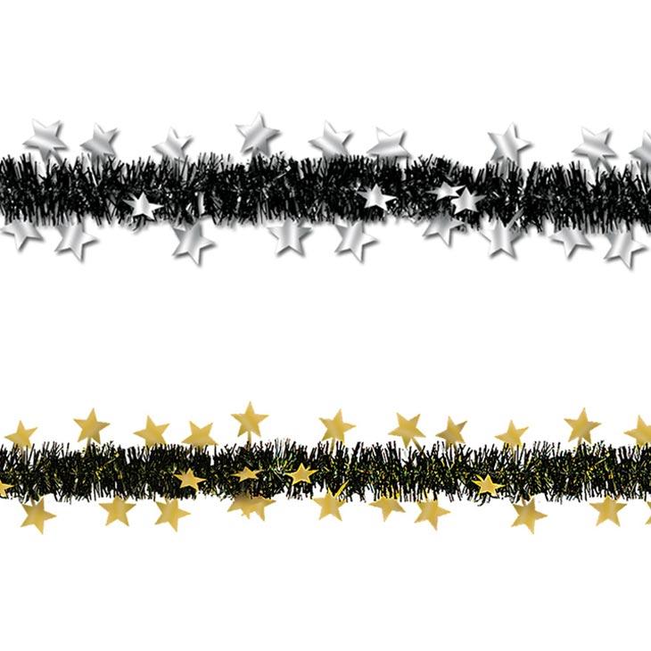 Sterne, Sterne und noch mehr Sterne! Diese Girlande ist besonders schick und bringt durch die Verarbeitung aus Lametta-Streifen und metallischer Folie einen Hauch "Glanz & Glamour" in den Partyraum. Die glänzende Girlande besteht aus vielen, kleinen Folienstreifen in Schwarz und ist entweder mit goldenen oder mit silbernen Sternen versehen. Die Stern-Girlande schimmert somit im ganzen Raum und kann alternativ natürlich auch zur Weihnachtsfeier oder zur Silvesterparty verwendet werden.